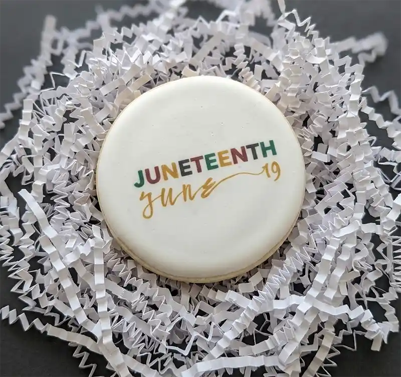 Individually sealed sugar cookies — durable, no cooling required, standardized across every location. Business Boosters designed the Juneteenth artwork, managed production, and coordinated fulfillment with a personal note in every box across all 146 locations.